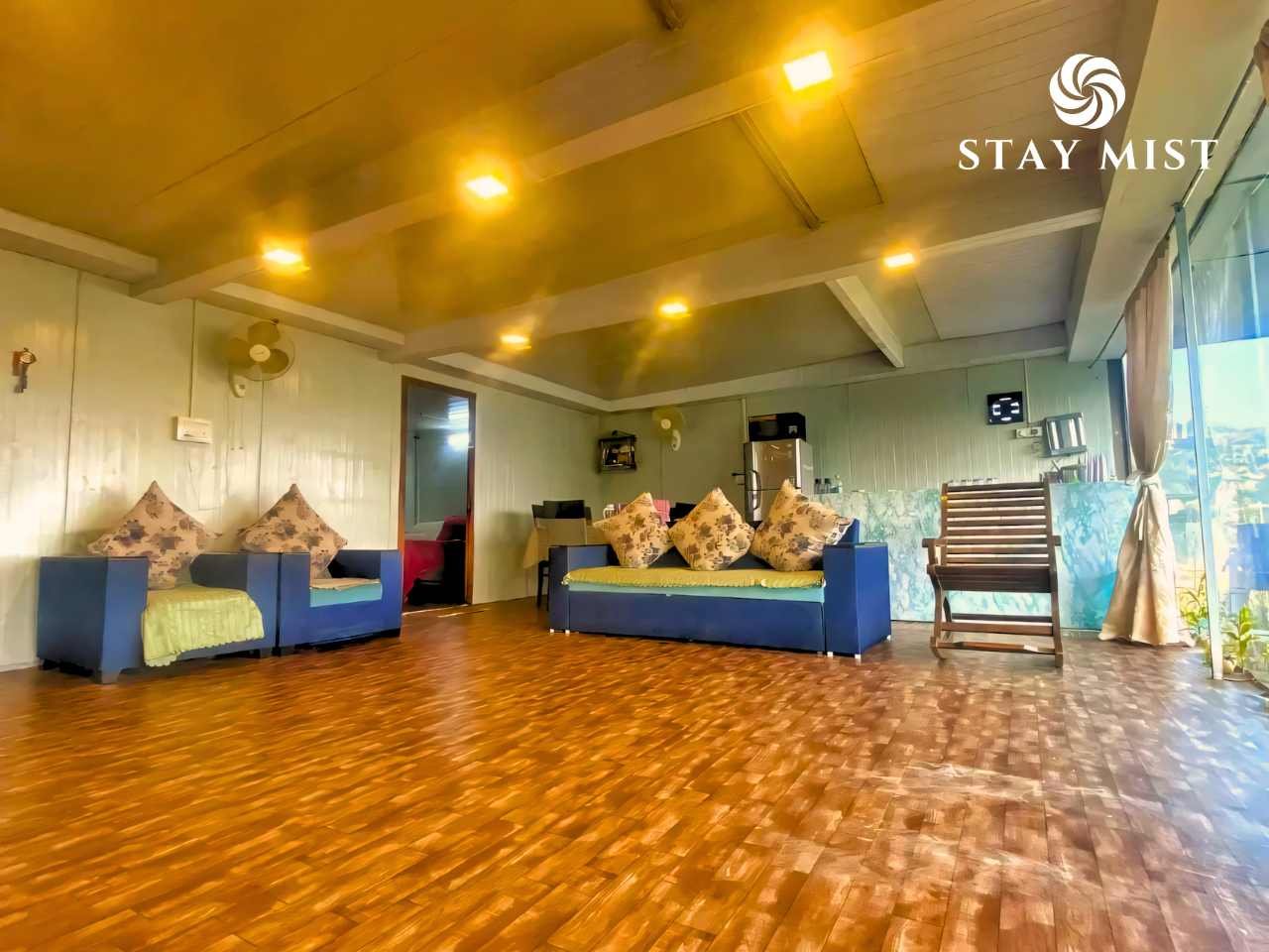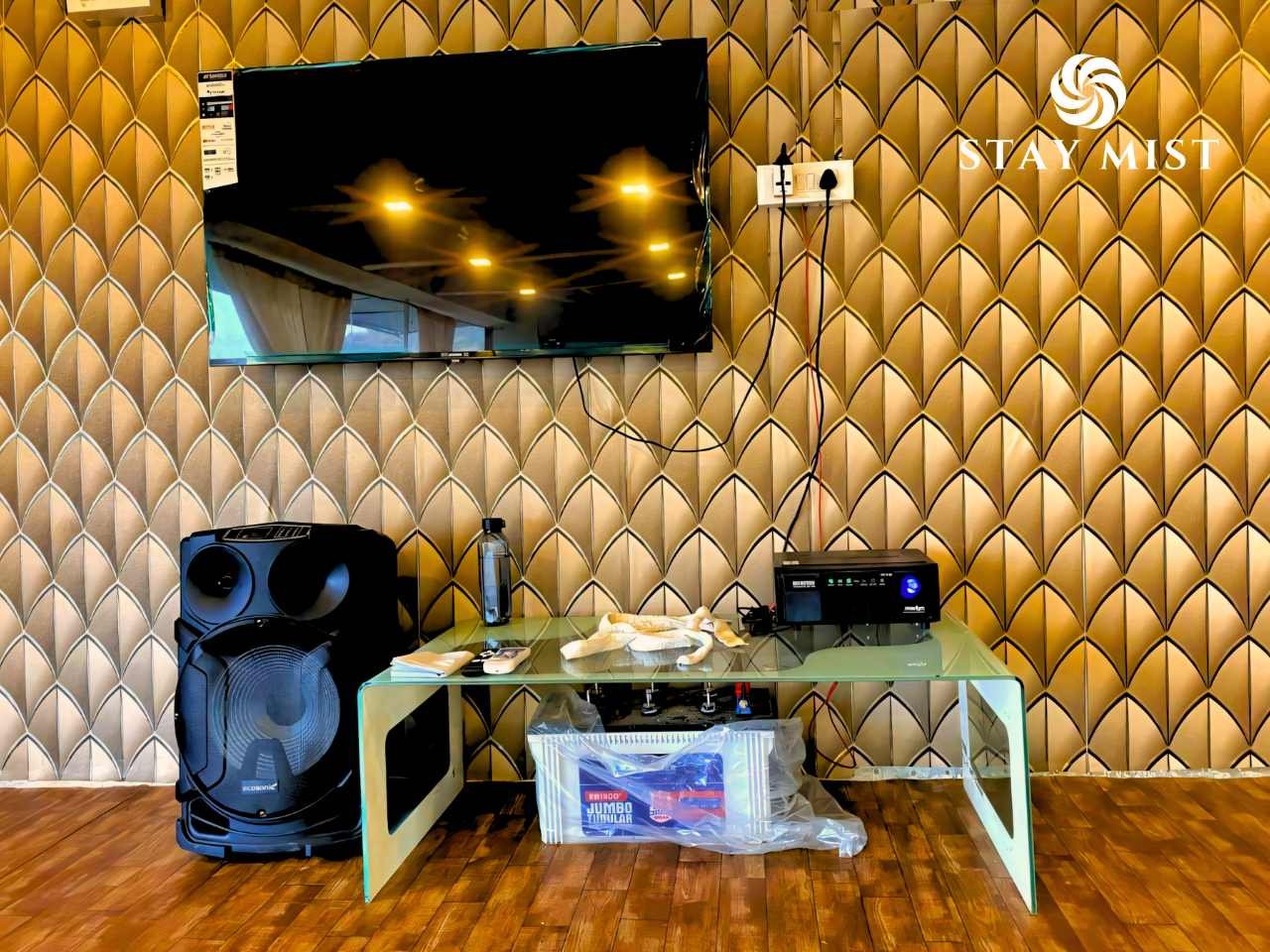 The living room is spacious, air-conditioned, and designed for group gatherings. It comes with a comfortable seating area and an LED TV for entertainment.