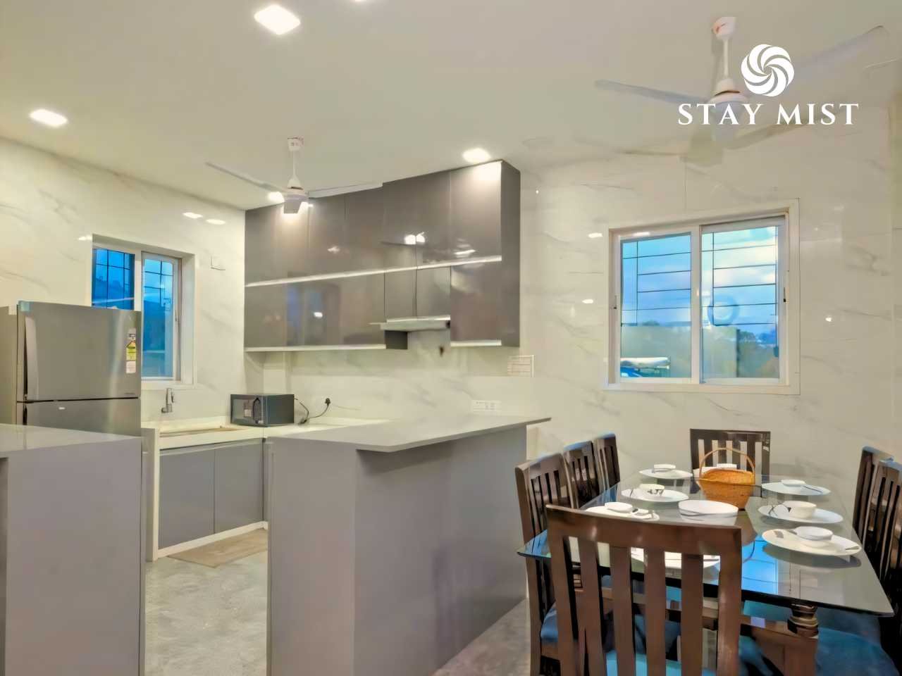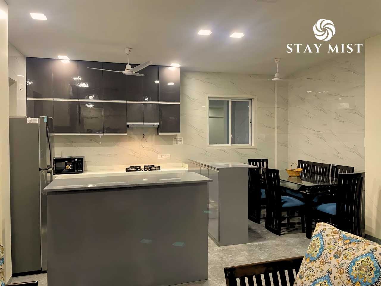 Equipped with fridge, microwave, and Aqua-Guard. Suitable for light cooking and reheating.